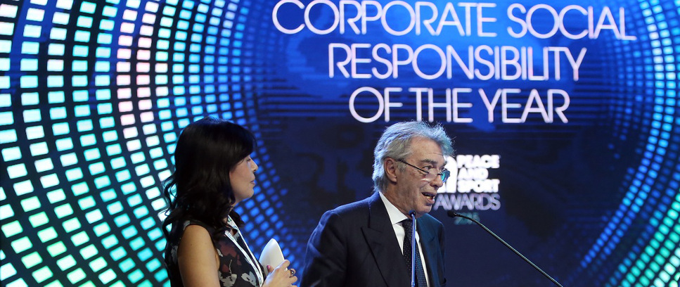 Massimo Moratti e la figlia Carlotta ritirano il premio come miglior programma di Responsabilità Sociale durante la cerimonia dei Peace and Sport Awards a Monte Carlo